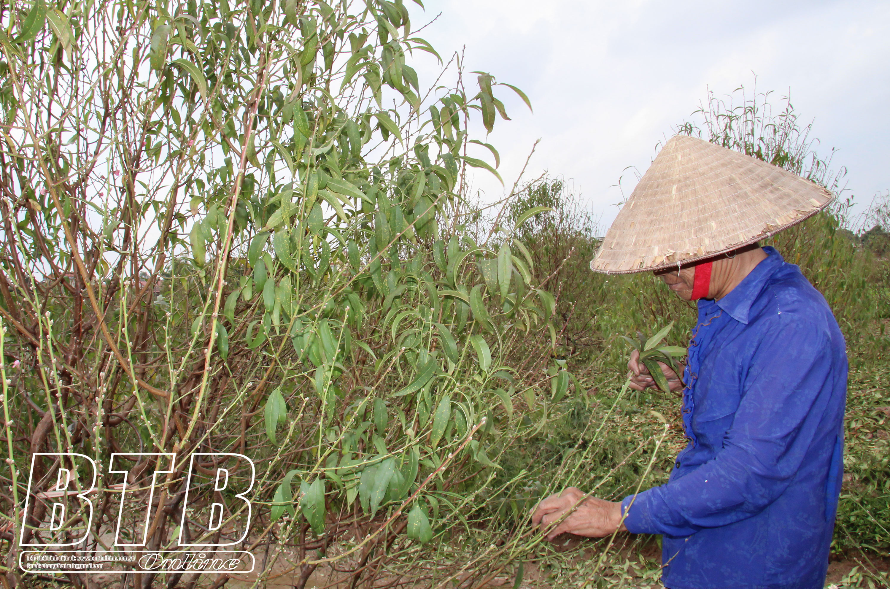 Anh Trần Văn Được, thôn Đình Phùng, xã Minh Tân (Đông Hưng) tranh thủ tuốt nốt những chiếc lá cuối cùng cho cây đào 8 năm tuổi của gia đình.