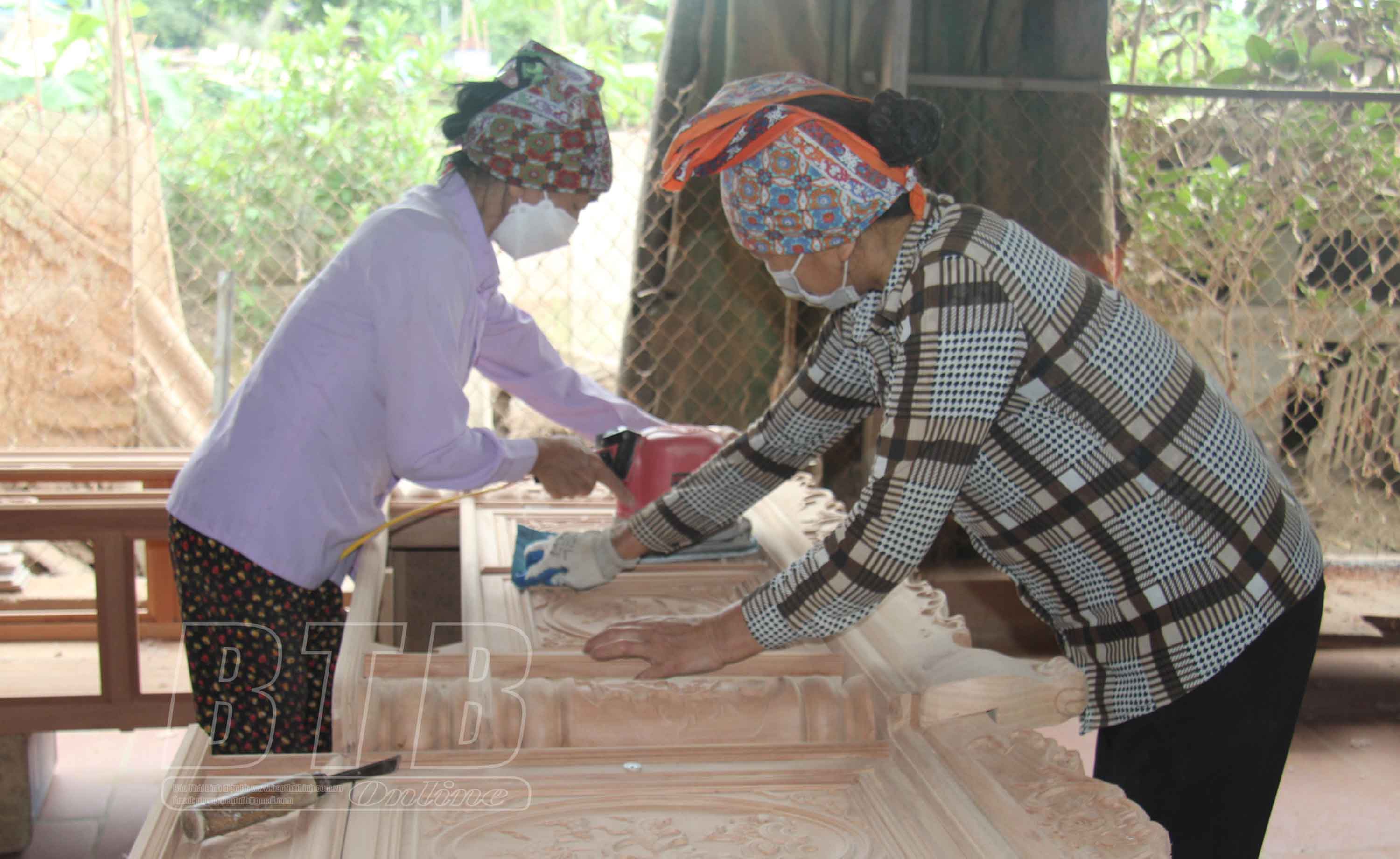 Rời xưởng sản xuất của ông Hưng, chúng tôi đến xưởng của bà Khúc Thị Huệ. Bà Huệ là một trong những người có thâm niên trong nghề sản xuất bàn ghế, giường, tủ, kệ... xuất cho thị trường trong nước. Hiện xưởng của bà Huệ đang tạo việc làm cho 7 lao động, chủ yếu là phụ nữ trong thôn với thu nhập từ 150.000 - 200.000 đồng/ngày, nếu là thợ phun màu thì thu nhập trên 1 triệu đồng/ngày. Một tháng xưởng của bà xuất 5 chuyến hàng, mỗi chuyến 10 bộ bàn ghế, 6 bộ kệ, 3 - 4 chiếc tủ.