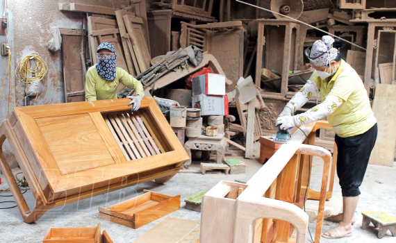 Ông Phạm Văn Lưỡng, Chủ tịch UBND xã cho biết: Trong 2 năm 2020 - 2021, dịch Covid-19 đã tác động nặng nề đến hoạt động sản xuất, kinh doanh của làng nghề tại địa phương. Số đơn hàng của hầu hết các doanh nghiệp, cơ sở, hộ sản xuất tại làng nghề giảm sâu, nhu cầu tiêu thụ các sản phẩm đồ gỗ mỹ nghệ của người dân giảm, kể cả thời gian cao điểm như dịp tết Nguyên đán. Đặc biệt, xã có 2 thời điểm (tháng 4/2020 và tháng 11/2021) thực hiện giãn cách xã hội để phòng, chống dịch Covid-19 khiến hầu hết các doanh nghiệp, cơ sở, hộ sản xuất tại làng nghề phải tạm dừng hoạt động. Doanh thu, lợi nhuận của các cơ sở sản xuất và thu nhập của người lao động đều giảm từ 30 - 50% so với trước. Khi công tác phòng, chống dịch chuyển sang trạng thái bình thường mới, các hoạt động sản xuất, kinh doanh của làng nghề dần sôi động trở lại, giải quyết việc làm cho hơn 1.000 lao động trực tiếp và vệ tinh, thu nhập bình quân 6 - 7 triệu đồng/người/tháng.