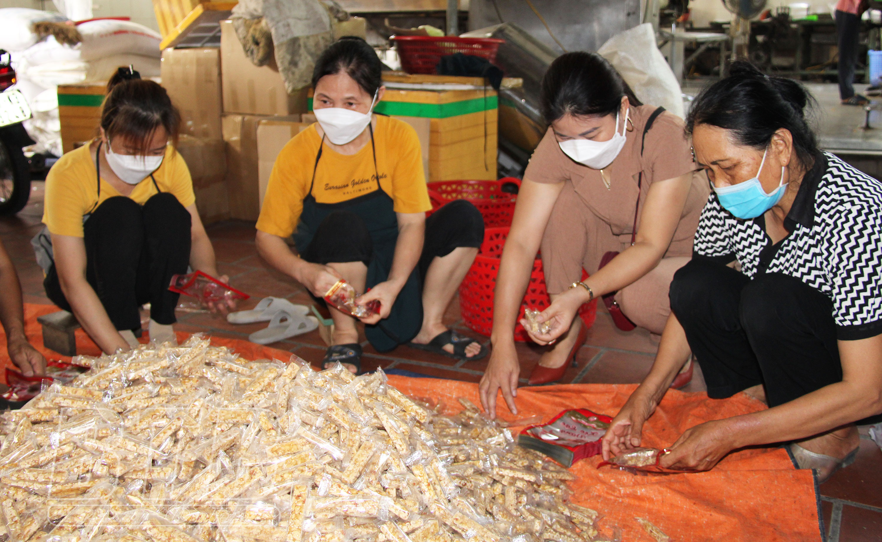 Đưa nghề làm bánh kẹo về quê, chị Hà Thị Thoan (áo vàng) không chỉ làm giàu cho gia đình còn giải quyết việc làm cho 10 lao động địa phương.