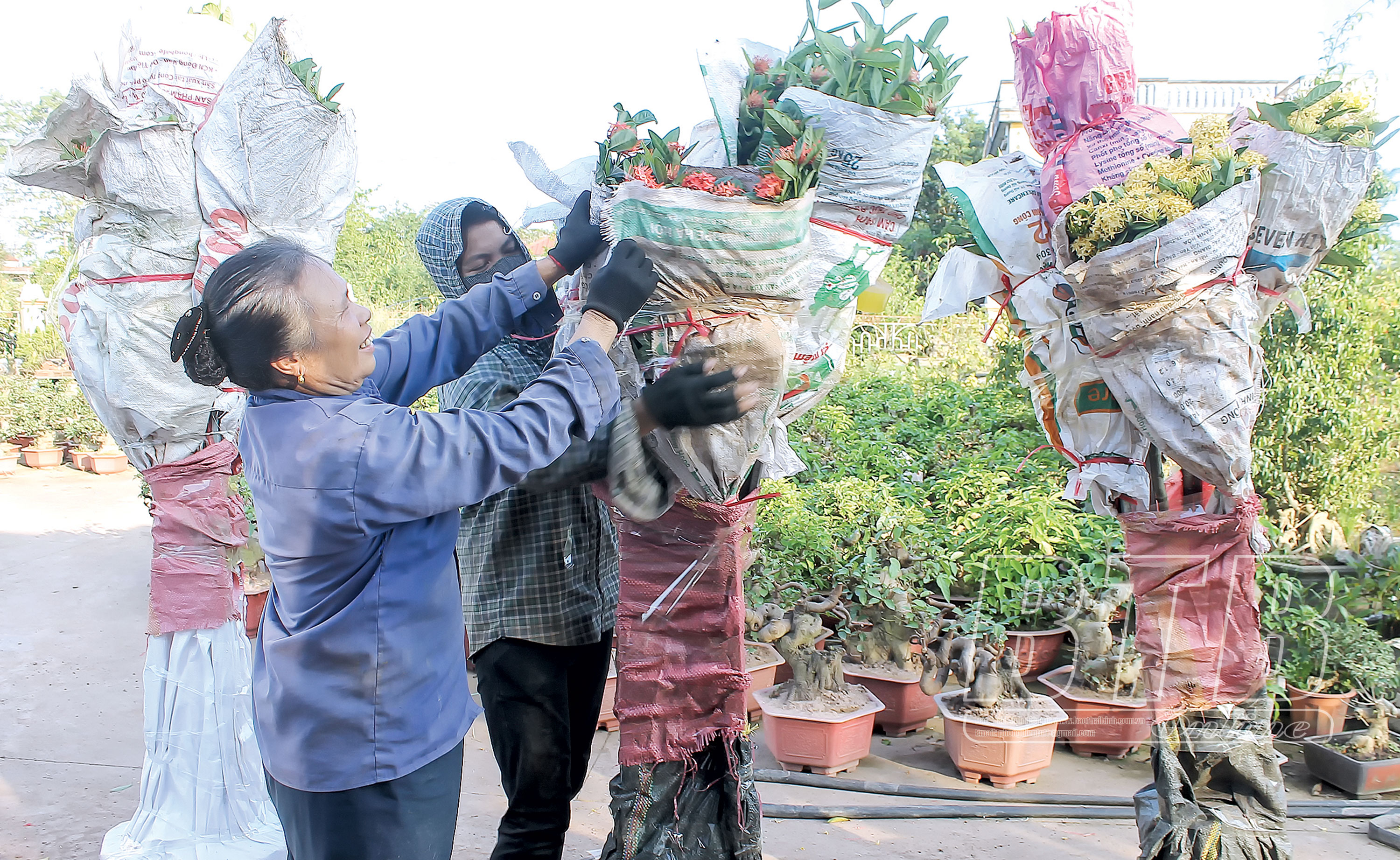 Trên khu vườn trồng mộc hương, mẫu đơn của gia đình anh Phi, chị Phạm Thị Hưng, chủ đại lý kinh doanh cây hoa, cây cảnh phường Kỳ Bá (thành phố Thái Bình) đang tỉ mỉ lựa chọn, đánh dấu từng cây. Chị Hưng chia sẻ: Muốn “thửa” được hàng đẹp cho thị trường tết, tôi chủ động nhập hàng sớm, trực tiếp đến các nhà vườn chọn, đặt mua cây rồi vận chuyển, dự trữ tại vườn nhà, chờ giáp tết, sức tiêu thụ mạnh mới xuất bán.