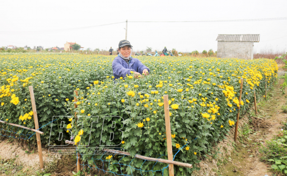 Cách vườn đào nhà ông Vữ khoảng 50m là vườn hoa cúc của gia đình chị Phạm Thị Minh. Nhờ kỹ thuật chăm sóc khoa học cùng với kinh nghiệm lâu năm, vườn hoa cúc nhà chị hứa hẹn sẽ nở đúng dịp tết. Phấn khởi vì giá hoa, cây cảnh cao hơn những năm trước, chị Minh chia sẻ: Thời điểm giáp tết Nguyên đán là những ngày mong mỏi nhất của người trồng hoa, cây cảnh trong thôn sau 1 năm vất vả chăm sóc và chờ đến ngày thu hoạch. May mắn cho người trồng là gần tết thời tiết thuận, hoa nở đẹp, quất quả to đều nên người dân khắp nơi đổ về các nhà vườn để đặt mua. Chỉ còn hơn 1 tuần nữa là đến tết, nếu giá cả như thời điểm hiện tại cao gấp 1,5 lần so với năm ngoái sẽ giúp tôi và nhiều gia đình trong thôn có một cái tết đủ đầy.