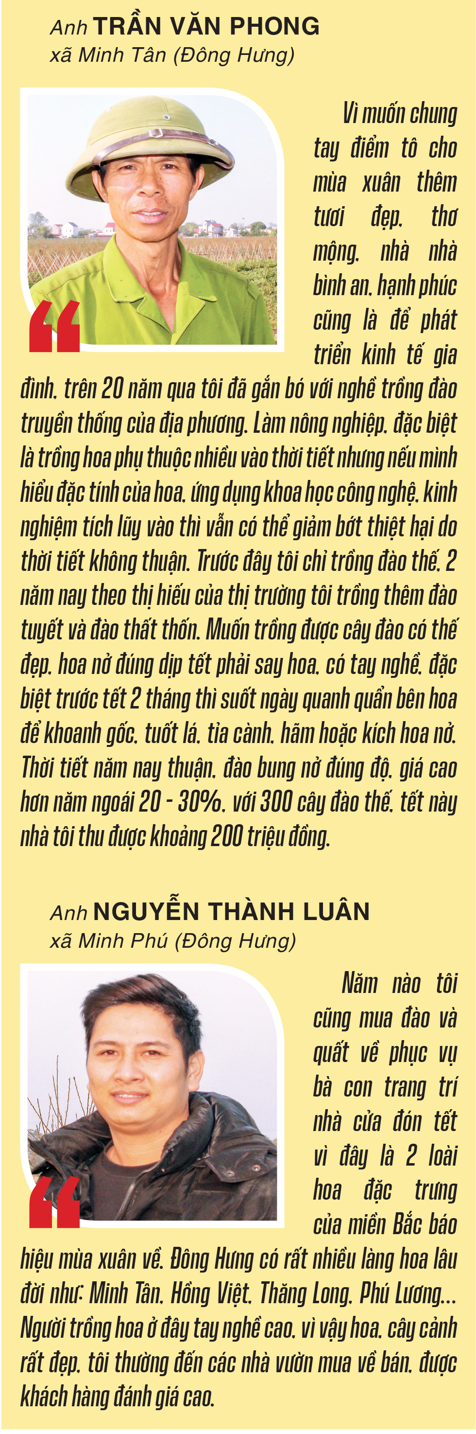 Anh Nguyễn Trọng Động, xã Phú Lương - ông chủ của gần 1.000 gốc đào bích, đào phai, trong đó có gần 50% là đào rừng cho biết: Nếu dành tình yêu đặc biệt cho hoa thì sẽ dễ dàng hiểu được ý nghĩa, đặc tính riêng của hoa để trồng đúng cách, chăm đúng kiểu, cho ra sản phẩm như ý và còn để tư vấn cho khách mua hoa. Đó cũng là bí quyết thành công của anh Động trong suốt 20 năm trồng đào tết.