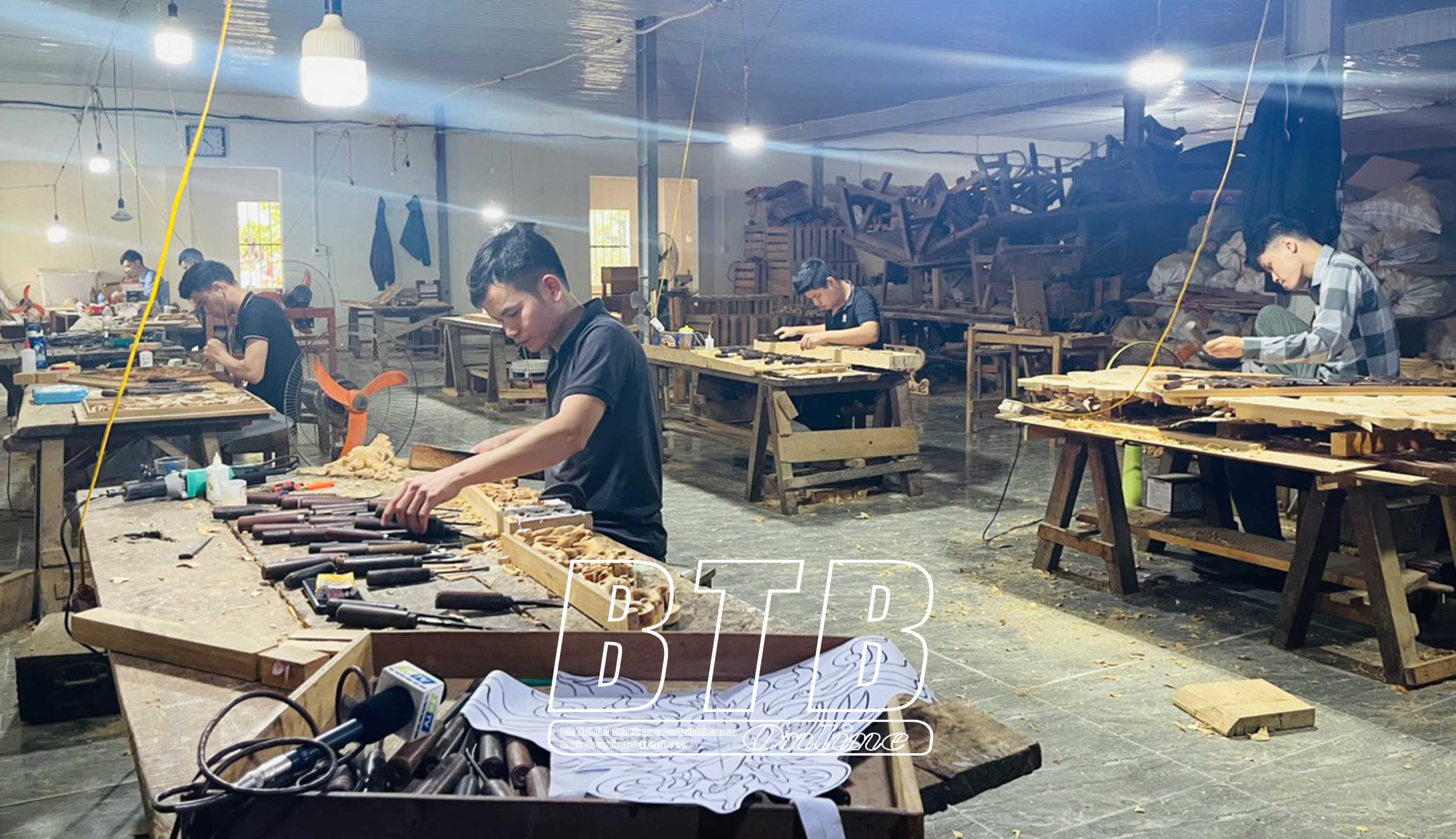Thăm xưởng sản xuất đồ gỗ mỹ nghệ của chị Tiền chúng tôi thấy được không khí lao động hăng say của hàng chục lao động cặm cụi, chau chuốt tỉ mỉ đường nét tinh tế cho từng sản phẩm như: hoành phi, câu đối, đèn lồng, tranh phù điêu trần nhà, cửa võng, tượng thờ...