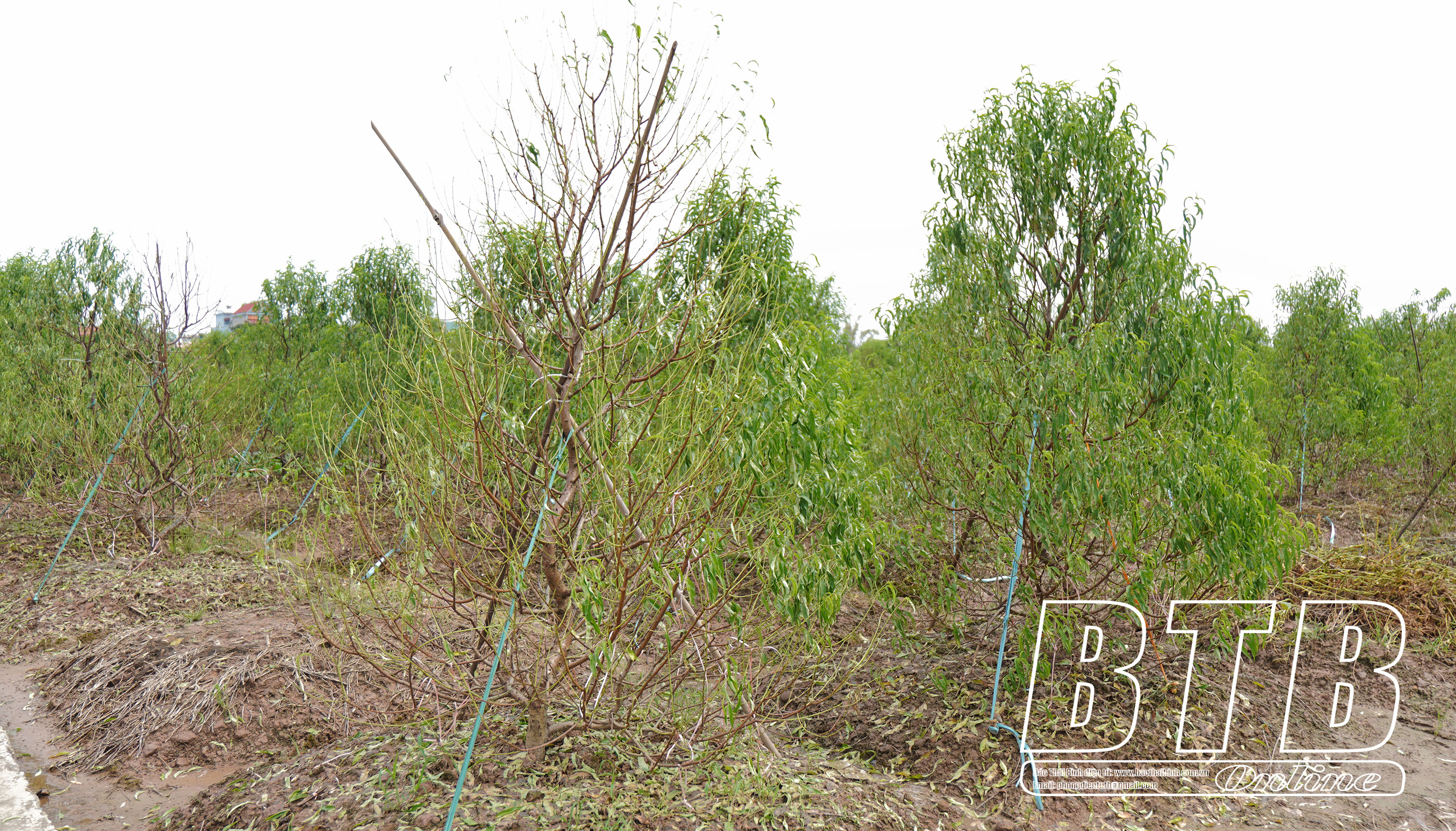 Vườn đào tại xã Minh Tân (Đông Hưng) đang héo dần do ảnh hưởng của thiên tai.