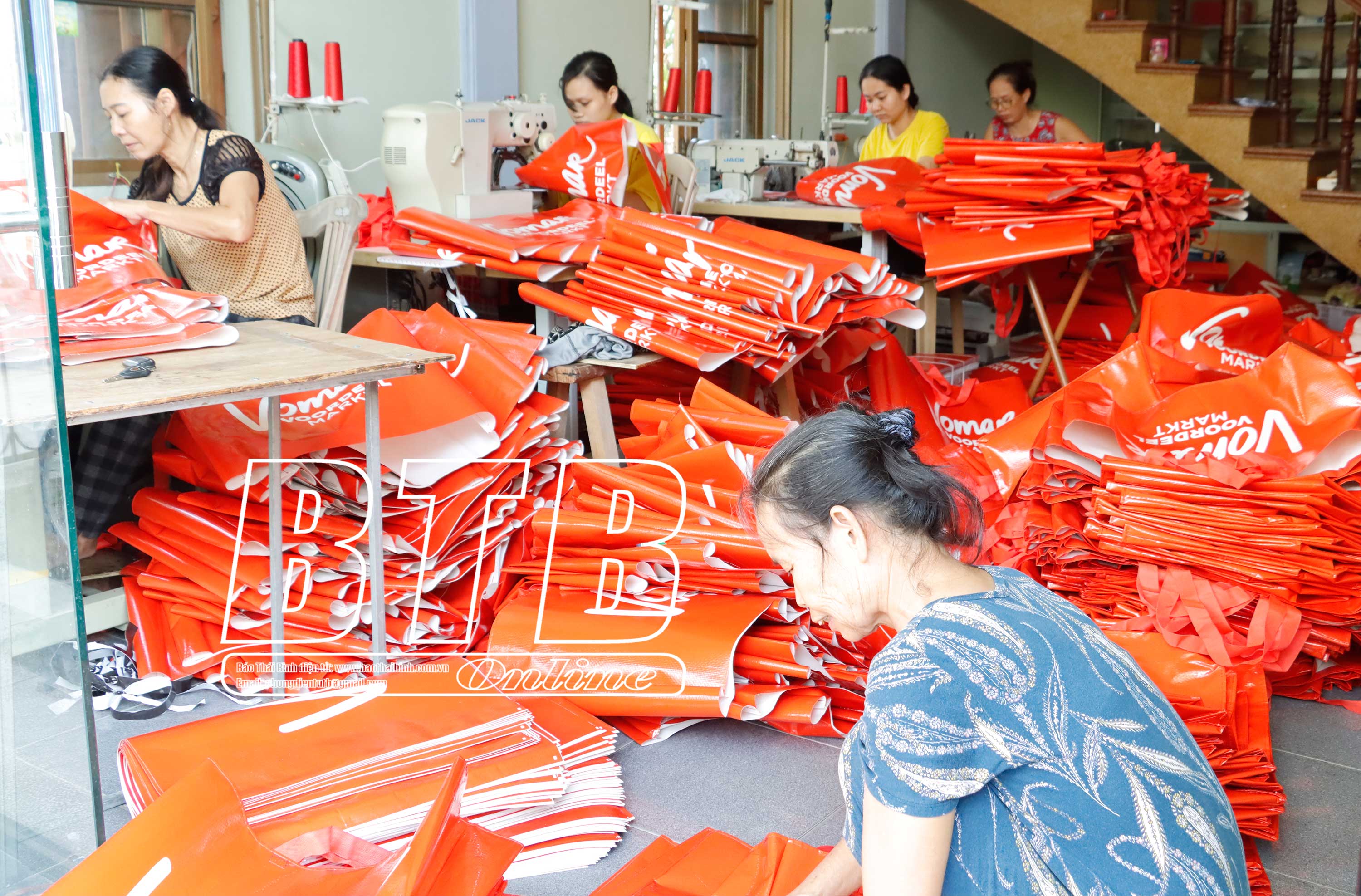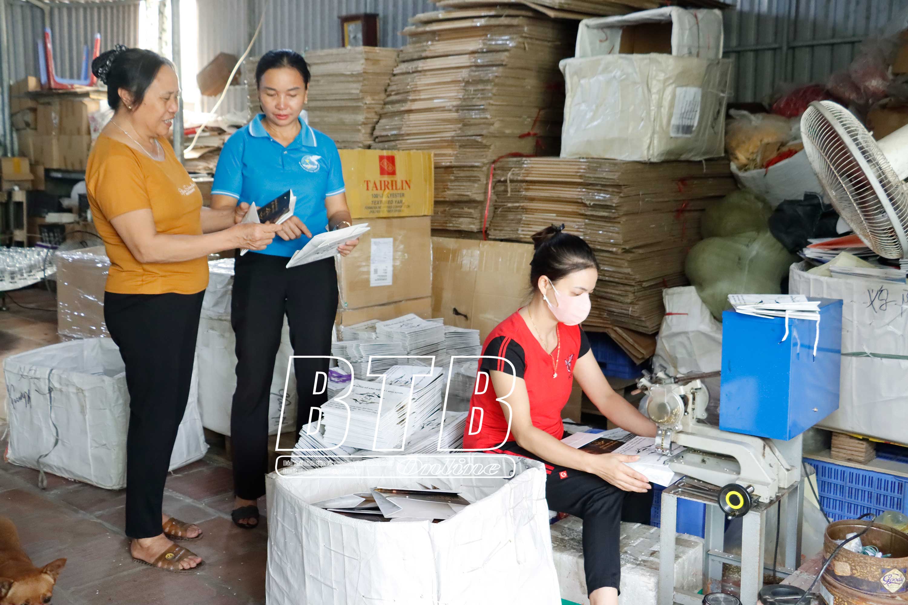 Bà Phạm Thị Duyên (người đầu tiên bên trái) - chủ cơ sở sản xuất Đồng Tâm, xã Phú Châu có thu nhập trên 300 triệu đồng/năm từ nghề in, gấp túi.