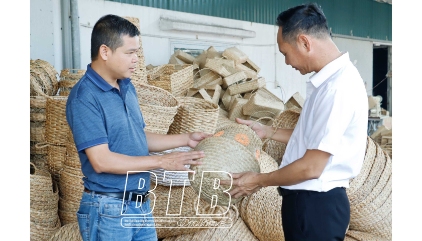 Công ty TNHH Mỹ nghệ Phương Đông của anh Phạm Hữu Khoan (người bên trái) sản xuất 50.000 sản phẩm mây tre đan/tháng