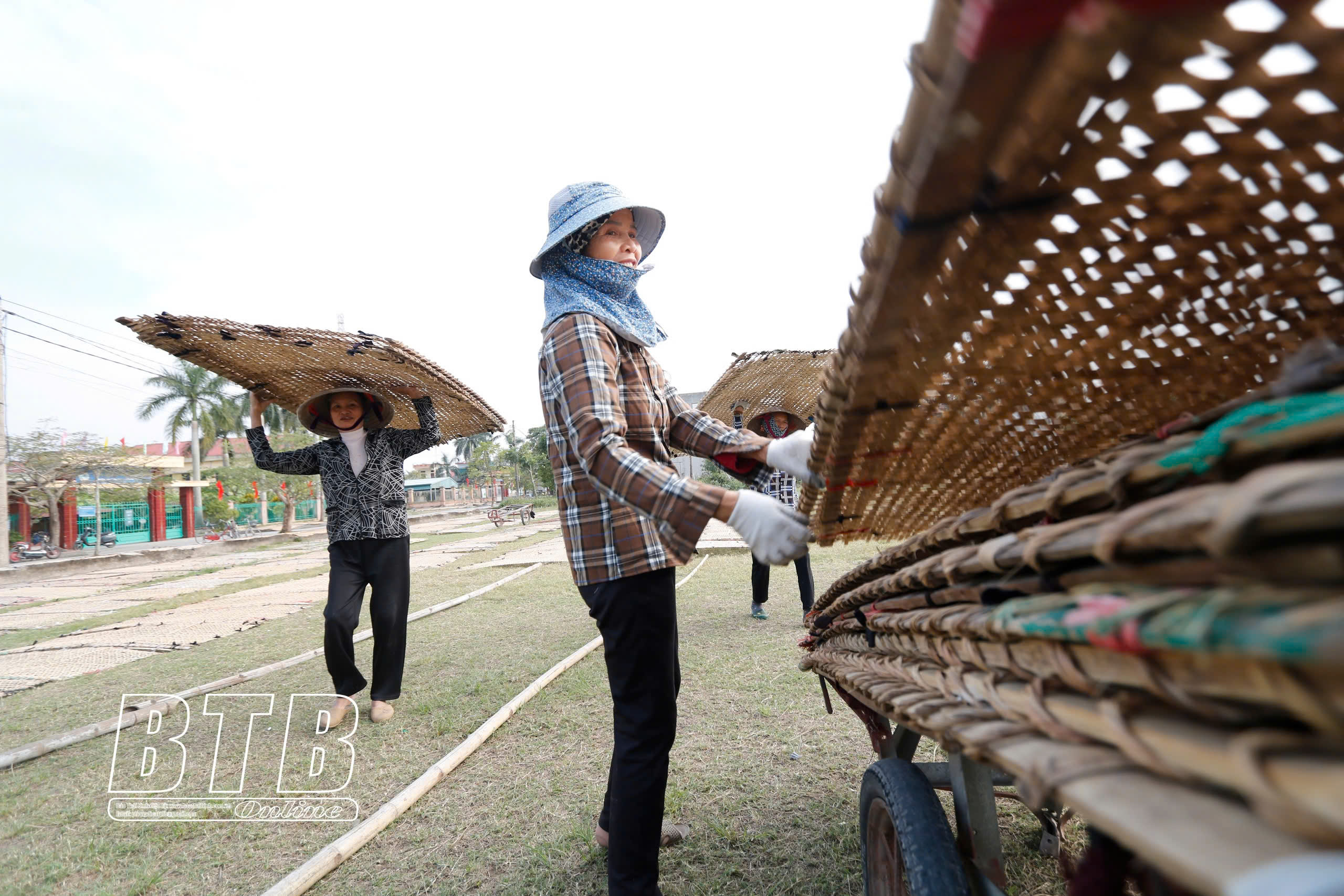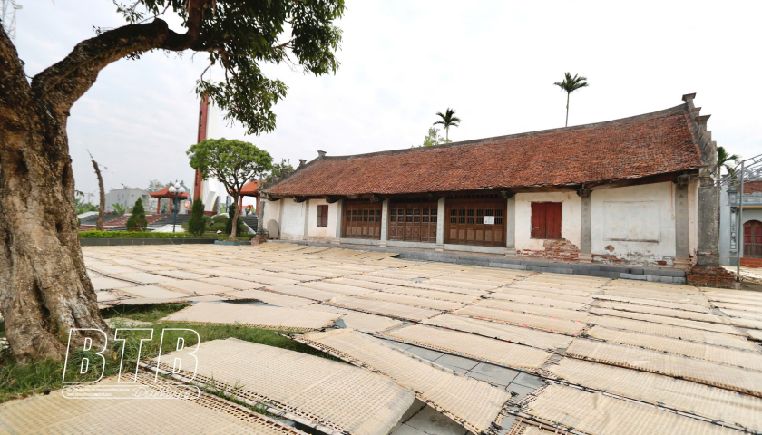 Những miếng bánh lớn sau khi tráng sẽ được phủ lên tấm phên và phơi khoảng 2 - 3 tiếng dưới trời nắng.
