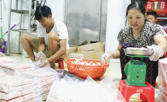 Cơ sở của anh Trứ có 3 - 4 lao động thường xuyên, tuy nhiên ở các khâu đòi hỏi kỹ thuật quan trọng như pha tỷ lệ nạc, mỡ, cho nước mắm, xay thịt anh trực tiếp đảm nhận. Vì vậy, mặc dù lượng hàng có thể tiêu thụ nhiều hơn nhưng để bảo đảm chất lượng sản phẩm và hàng chỉ lưu thông trong ngày, mỗi ngày gia đình anh Trứ chỉ sản xuất từ 30 - 50kg giò, chả, xúc xích thành phẩm. Giá bán trung bình từ 80.000 - 100.000 đồng/kg giò, chả; từ 110.000 - 120.000 đồng/ kg xúc xích.