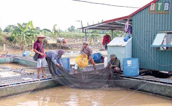 Gia đình anh Nguyễn Văn Bản, thôn Tân Mỹ, xã Quỳnh Ngọc thu hoạch cá lồng. Ảnh: PHẠM HƯNG