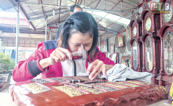 Đến cơ sở chạm bạc Thái Úy, chúng tôi còn cảm nhận rõ hơn về không khí làm việc gấp gáp ở đây. Anh Tạ Văn Úy, chủ cơ sở cho hay: Càng về cuối năm các đơn đặt hàng càng nhiều do tâm lý mua sắm chuẩn bị cho dịp tết của người Việt. Nhiều gia đình cũng chọn thời điểm này để khánh thành và trang trí nhà cửa nên chúng tôi phải thuê thêm thợ để sản xuất nhanh hơn. Hơn nữa, các mặt hàng ở đây rất phù hợp để trang trí như tranh, đồ thờ, linh kiện đồng hồ, mỗi loại tôi làm hàng trăm sản phẩm song tới thời điểm này cũng đã hết hàng. Nghề này quan trọng nhất là phần chạm, ăn nhau là ở khâu này nên tôi vẫn duy trì làm thủ công. Nếu dùng máy ép thì ngày có thể ra hàng trăm bức tranh nhưng nếu làm thủ công thì mấy người làm vài ngày mới được một bức. Người tiêu dùng nếu không tinh sẽ mua phải hàng ép bằng máy nhưng cũng không ít khách về tận Đồng Xâm mua để bảo đảm độ tinh tế của sản phẩm.