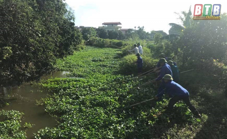 Đoàn thanh niên vớt bèo bồng khơi thông dòng chảy. Ảnh: Đỗ Hiền