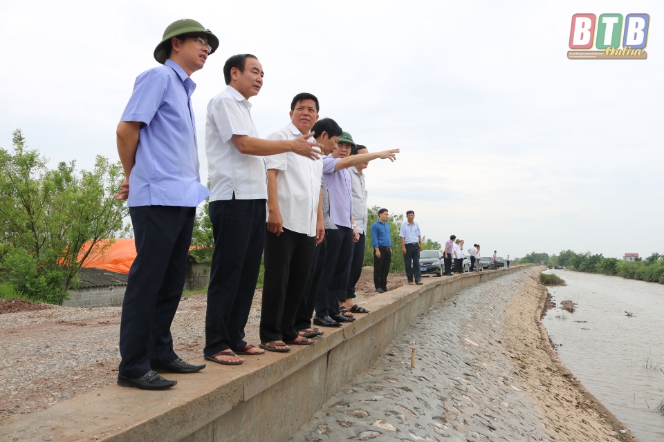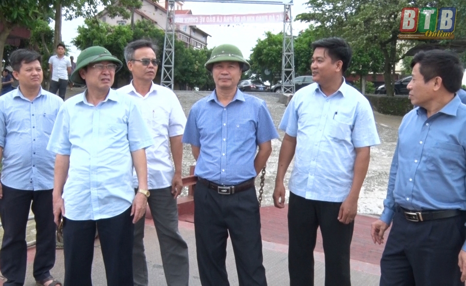 Các đồng chí: Vũ Đức Hằng, Ủy viên Ban Thường vụ, Trưởng ban Nội chính Tỉnh ủy; Nguyễn Hoàng Giang, Tỉnh ủy viên, Phó Chủ tịch UBND tỉnh kiểm tra công tác ứng phó với bão số 4 tại huyện Vũ Thư. Ảnh: Thu Trang
