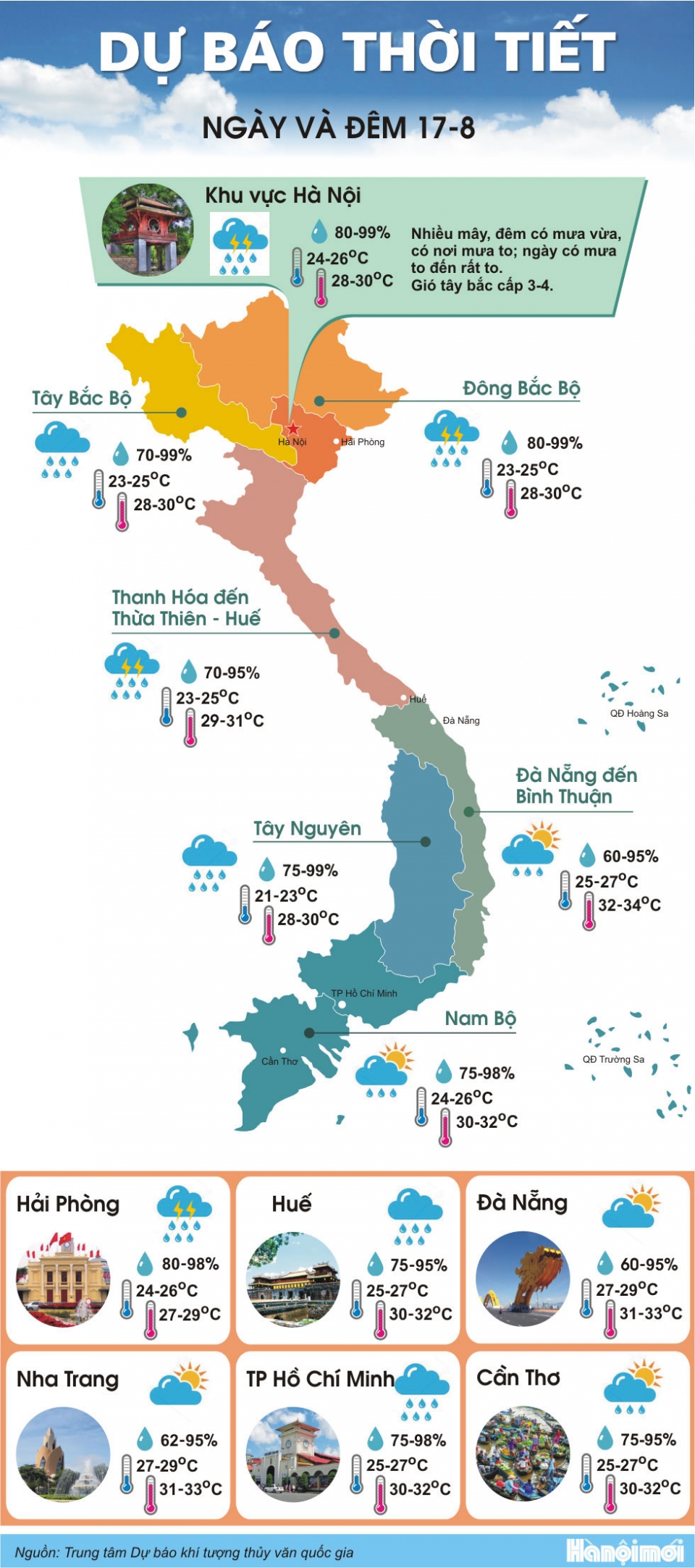 Do ảnh hưởng của bão, hôm nay và ngày mai ở các tỉnh Bắc Bộ và Bắc Trung Bộ có mưa to đến rất to, trọng tâm mưa tập trung ở khu vực đồng bằng và trung du Bắc Bộ, các tỉnh Sơn La, Hòa Bình, Thanh Hóa, Nghệ An. Hà Nội sẽ có mưa rất to (lượng mưa phổ biến 150-200mm).