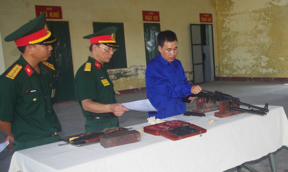 Được tổ chức từ 13/8, Hội thi Nhà kho, nhà xe quân khí tốt, thủ kho quân khí giỏi năm 2018 của LLVT tỉnh với 3 nội dung thi nhà xe - công tác kỹ thuật xe máy bao gồm: chấm điểm nhà để xe ô tô, mô tô của đơn vị; hệ thống văn quản, sổ sách quản lý nghiệp vụ; thi xe tốt theo tiêu chuẩn kỹ thuật chuyên ngành và nội dung công tác kỹ thuật quân khí bao gồm: thi nhà kho quân khí theo 5 nội dung của các đơn vị, hệ thống sổ sách, mẫu biểu quản lý…và nội dung thi nhận thức của thủ kho quân khí bằng hình thức thi tự luận, trắc nghiệm và thực hành.
