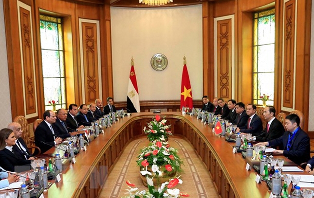 Hai nhà lãnh đạo đã thông báo cho nhau tình hình mỗi nước, hài lòng ghi nhận những tiến triển tích cực trong quan hệ hợp tác giữa hai nước trong thời gian gần đây với việc tổ chức Kỳ họp lần thứ nhất của Tiểu ban hợp tác về thương mại và công nghiệp tại Ai Cập và tháng 4-2018 nhằm triển khai các kết quả đạt được tại Kỳ họp lần thứ 5 Ủy ban liên chính phủ Việt Nam – Ai Cập tháng 8-2017. Thông qua các cơ chế hợp tác nói trên, đã thống nhất được các biện pháp cụ thể nhằm tăng cường quan hệ hợp tác trên nhiều lĩnh vực, đặc biệt trong 6 tháng đầu năm 2018, kim ngạch thương mại song phương đạt 230 triệu USD, tăng 44,5% so với cùng kỳ năm 2017.