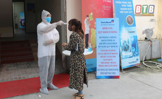 Mọi khách hàng đến giao dịch tại Ngân hàng Thương mại cổ phần Công thương Việt Nam Chi nhánh Thái Bình đều thực hiện nghiêm túc các biện pháp phòng, chống dịch Covid-19.
