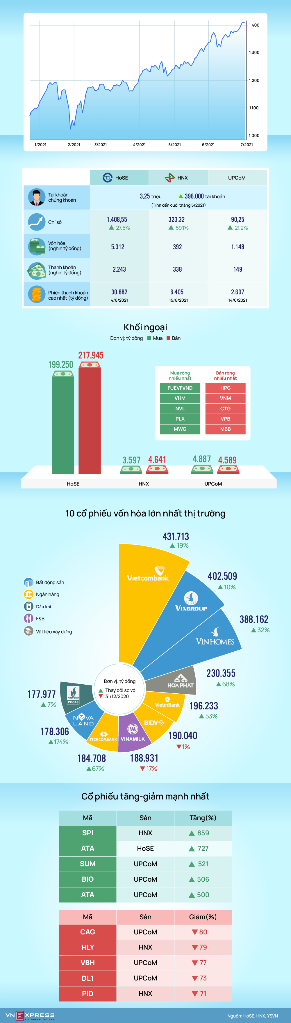 Ba chỉ số đại diện cho sàn HoSE, HNX và UPCoM đều tăng trưởng hai chữ số khi nhà đầu tư và dòng tiền mới ồ ạt gia nhập thị trường.