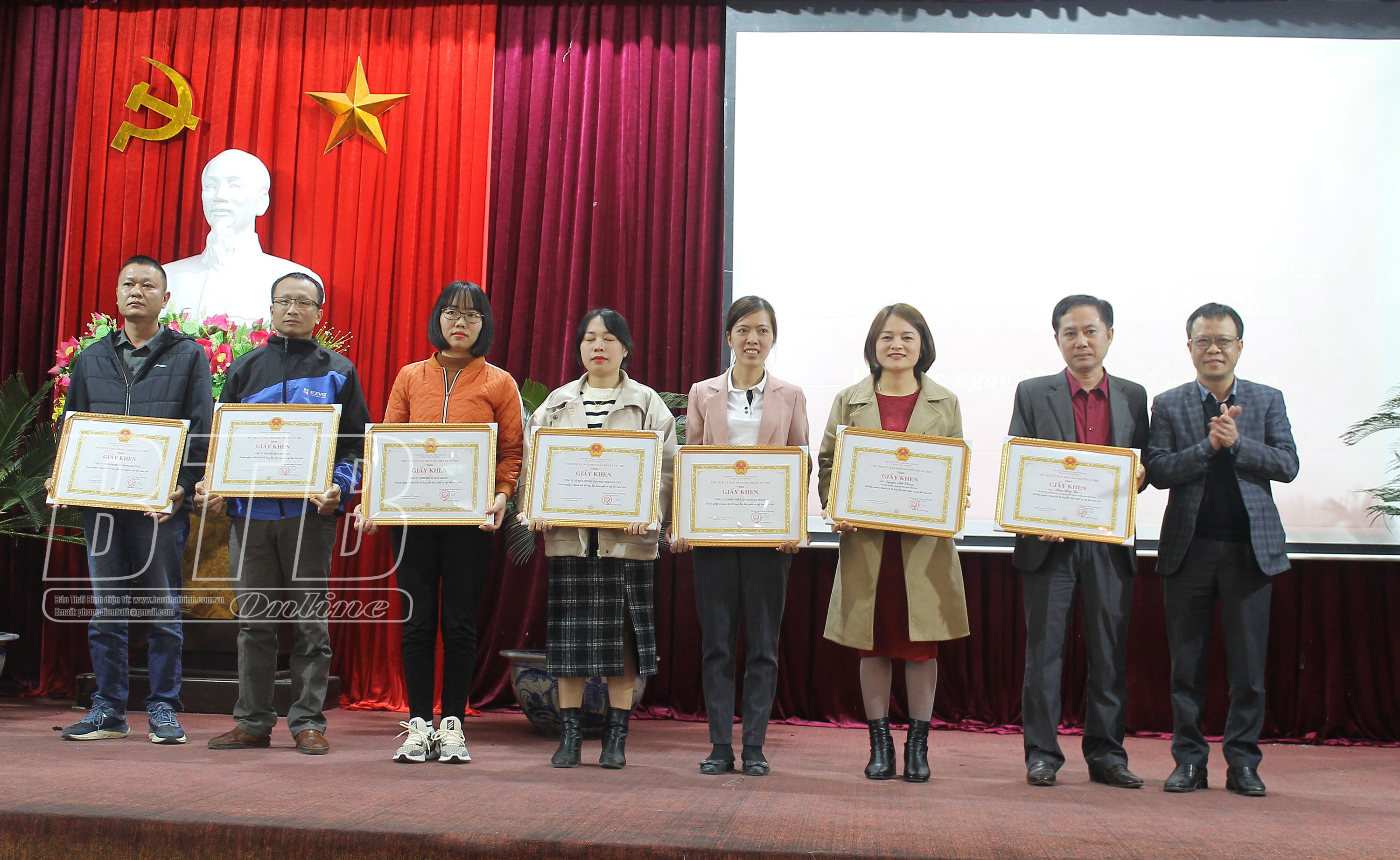 Lãnh đạo UBND huyện Vũ Thư trao giấy khen cho các doanh nghiệp, hộ kinh doanh có thành tích tiêu biểu trong thu, nộp ngân sách năm 2022.