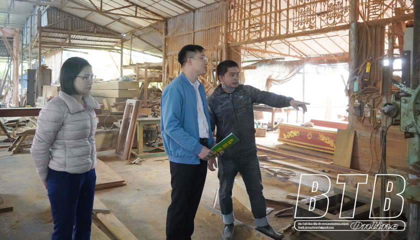 Anh Bùi Văn Bính (người ngoài cùng bên phải) thôn Tri Chỉ Nam, xã Thụy Trường phát triển xưởng sản xuất mộc từ vốn vay hỗ trợ tạo việc làm theo Nghị quyết số 11/NQ-CP của Chính phủ.