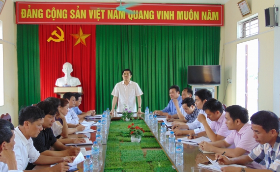 Đồng chí Nguyễn Hoàng Giang, Tỉnh ủy viên, Phó Chủ tịch UBND tỉnh, Trưởng ban đại diện Hội đồng quản trị Ngân hàng CSXH tỉnh phát biểu tại buổi làm việc với Ban Giảm nghèo xã Thụy Thanh.