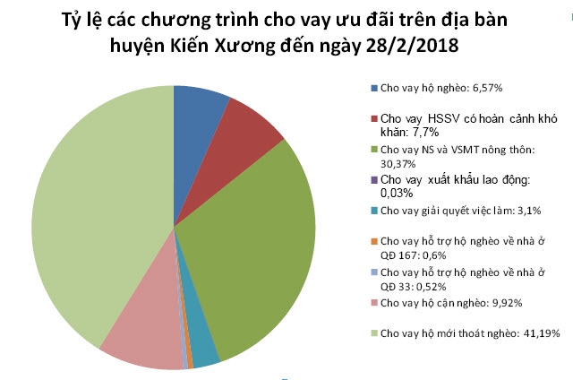 Đó là 2 trong số gần 12.400 hộ nghèo và các đối tượng chính sách của huyện Kiến Xương đang được vay vốn ưu đãi của Chính phủ. Trên địa bàn huyện hiện đang triển khai 9 chương trình cho vay ưu đãi của Chính phủ bao gồm: cho vay hộ nghèo, hộ cận nghèo, hộ mới thoát nghèo, nước sạch và vệ sinh môi trường nông thôn, giải quyết việc làm, học sinh sinh viên có hoàn cảnh khó khăn, xuất khẩu lao động, hỗ trợ hộ nghèo làm nhà ở theo Quyết định số 167/2008/QĐ-TTg và cho vay hỗ trợ hộ nghèo làm nhà ở theo Quyết định số 33/2015/QĐ-TTg. Đến ngày 28/2/2018, tổng dư nợ cho vay của các chương trình trên đạt 324,949 tỷ đồng.