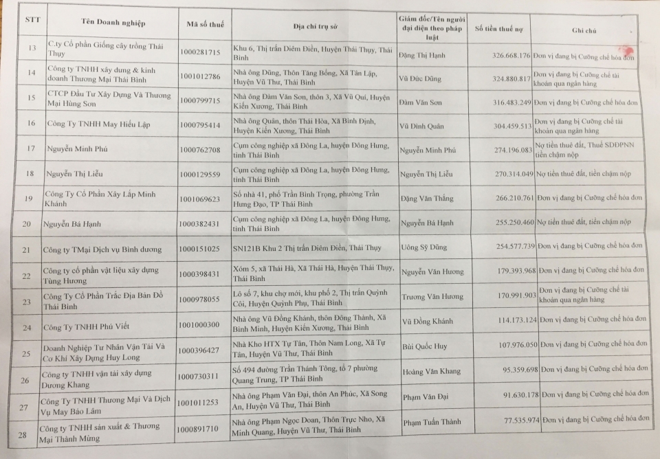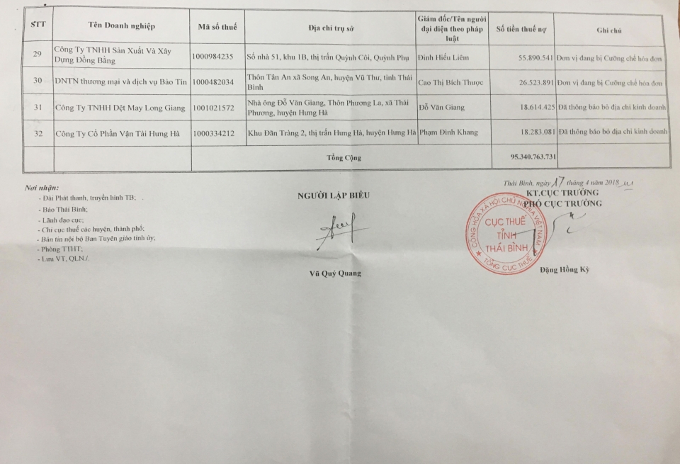 Danh sách công khai các doanh nghiệp và cá nhân nợ thuế
