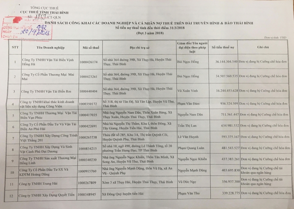 Danh sách công khai các doanh nghiệp và cá nhân nợ thuế - đợt 3 năm 2018.