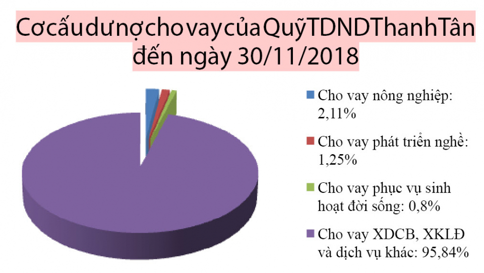 Từ đầu năm đến nay, Quỹ TDND Thanh Tân đã thực hiện giải ngân cho 645 lượt khách hàng vay vốn với tổng số tiền 77,252 tỷ đồng. Ngoài ra, Quỹ còn duy trì thực hiện thu lãi tiền vay vào ngày 28 hàng tháng nhằm tạo thói quen cho khách hàng đồng thời thông báo trước từ 15 - 20 ngày về thời hạn trả nợ tiền gốc và lãi vay để khách hàng có thời gian chuẩn bị. Chính vì thế, đến nay, tỷ lệ nợ xấu của Quỹ luôn duy trì ở mức thấp, chỉ chiếm 0,025% tổng dư nợ.