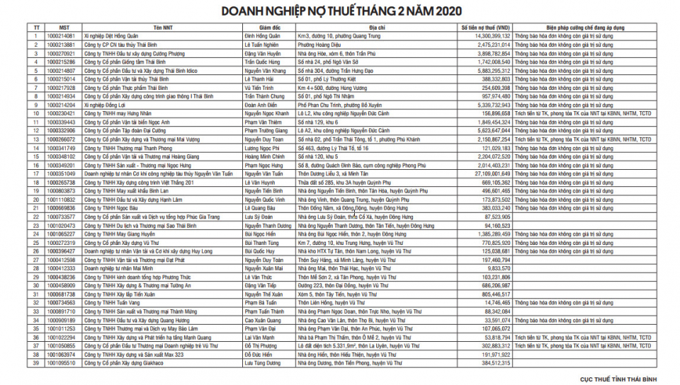 Doanh nghiệp nợ thuế tháng 2 năm 2020