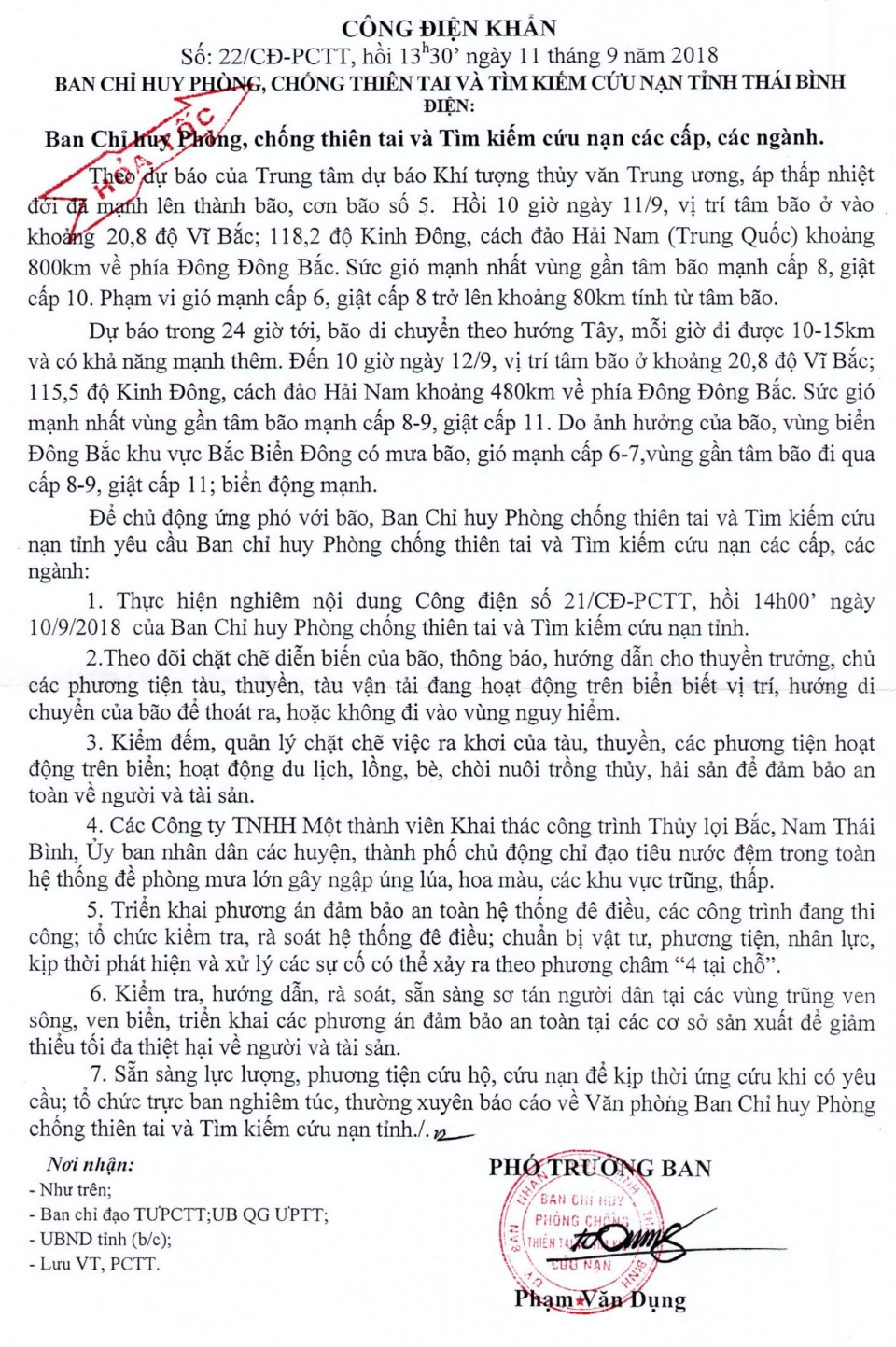Hồi 13h30 ngày 11/9/2018, Ban Chỉ huy Phòng chống lụt bão và TKCN tỉnh Thái Bình có Công điện khẩn số 22/CĐ-PCTT gửi Ban Chỉ huy PCTT và TKCN các cấp, các ngành.