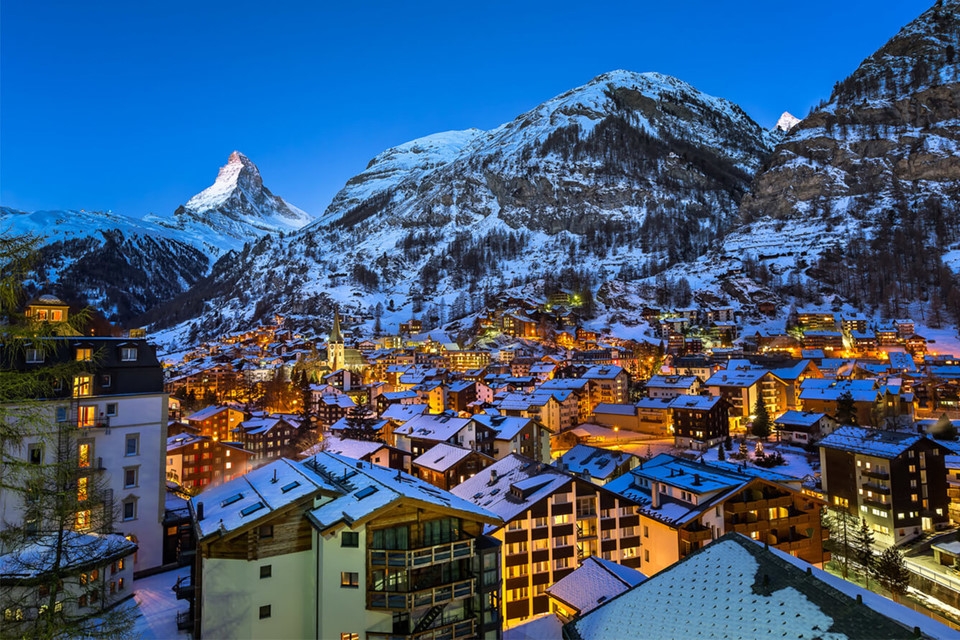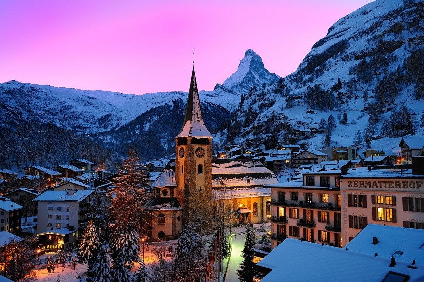 Làng Zermatt: Nằm dưới chân núi Matterhorn huyền thoại, Zermatt là một trong những resort trượt tuyết mà bất kỳ ai cũng ao ước đến thăm. Đặt bước đến đây, bạn sẽ bị thu hút bởi những con đường xinh xắn với vô vàn biệt thự bằng gỗ và không khí trong lành.