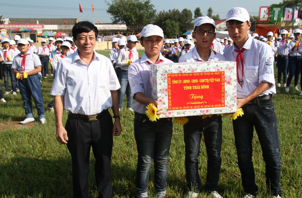 * Tại Hưng Hà, các đồng chí: Đặng Thanh Giang, Ủy viên Ban Thường vụ Tỉnh ủy, Chủ tịch Ủy ban MTTQ tỉnh; Phạm Văn Xuyên, Tỉnh ủy viên, Phó Chủ tịch UBND tỉnh đi thăm và tặng quà các em thiếu niên, nhi đồng xã Thái Phương, Văn Lang (Hưng Hà).