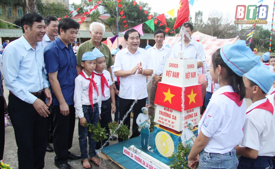 Đồng chí Nguyễn Tiến Thành, Ủy viên Ban Thường vụ, Trưởng ban Dân vận Tỉnh ủy thăm mô hình hội trại của các em thiếu niên, nhi đồng thị trấn Tiền Hải, huyện Tiền Hải. Ảnh: Tiến Đạt