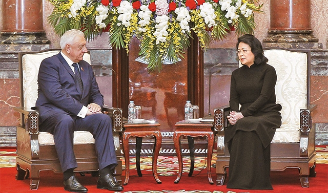 Quyền Chủ tịch nước Đặng Thị Ngọc Thịnh tiếp Chủ tịch Thượng viện Bê-la-rút M.Mi-a-xơ-nhi-cô-vích. Ảnh: LÂM KHÁNH (TTXVN)