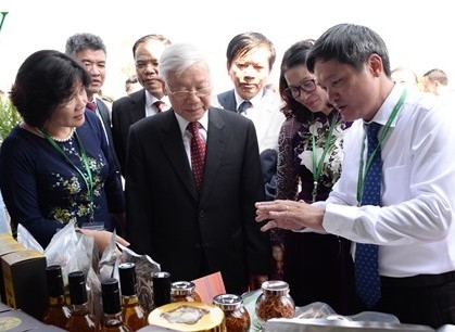 Tổng Bí thư tham quan khu trưng bày các sản phẩm nông nghiệp của Học viện