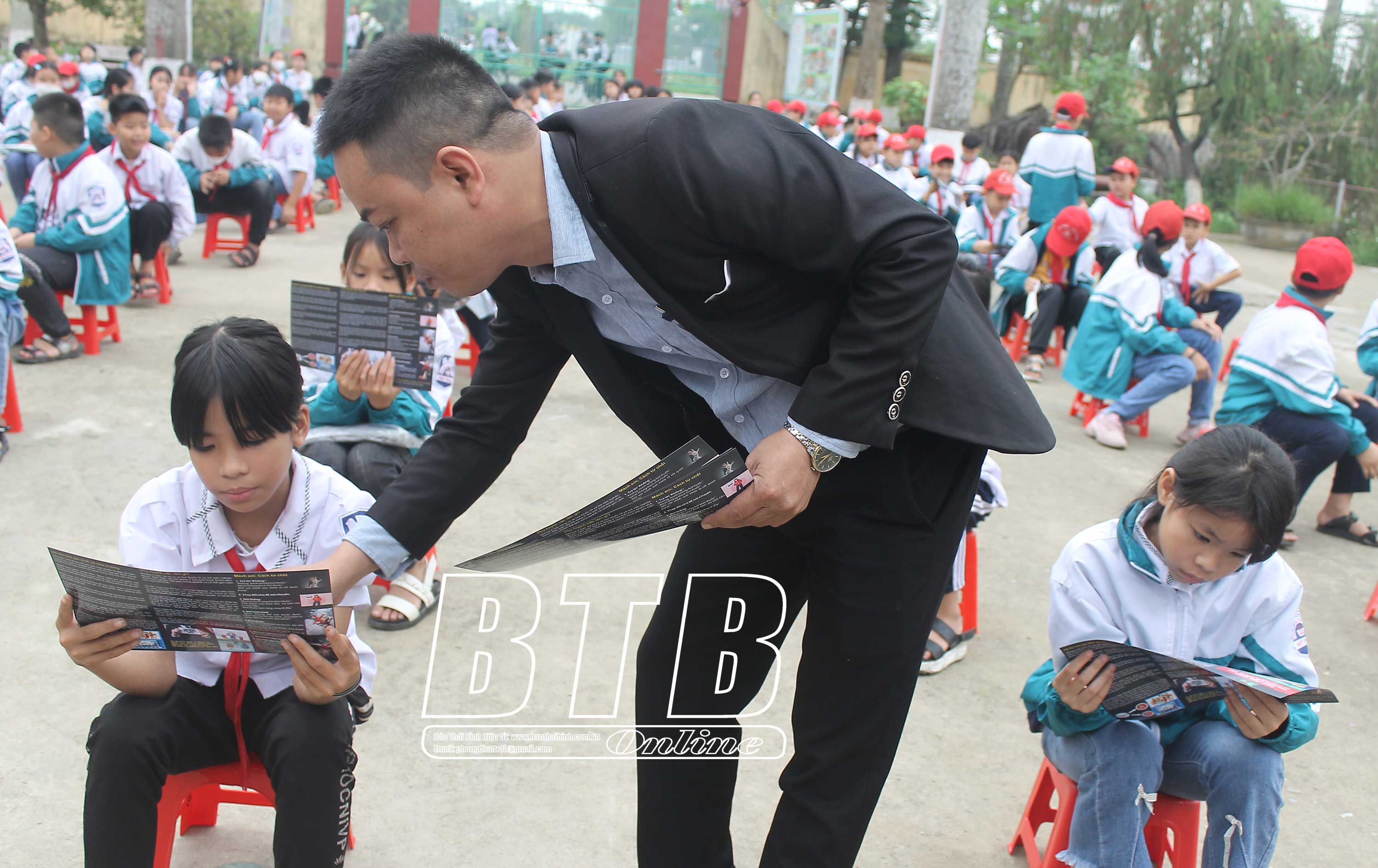 Anh Bùi Văn Nội tuyên truyền về tác hại của thuốc lá điện tử cho học sinh Trường Tiểu học Việt Thuận (Vũ Thư).