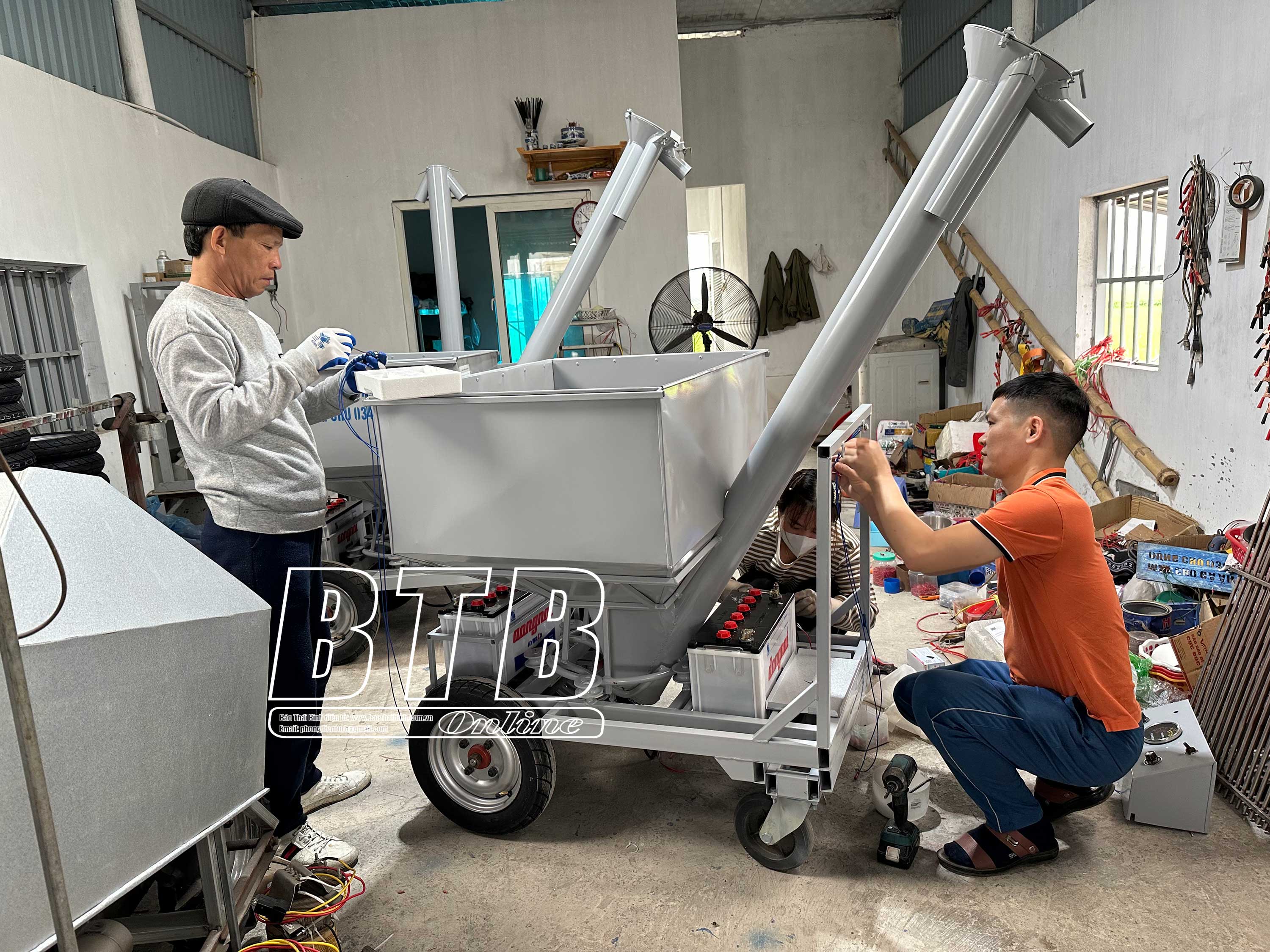 Anh Chu Sỹ Dựng (người bên phải) lắp ráp, chế tạo máy cho gà ăn tự động.