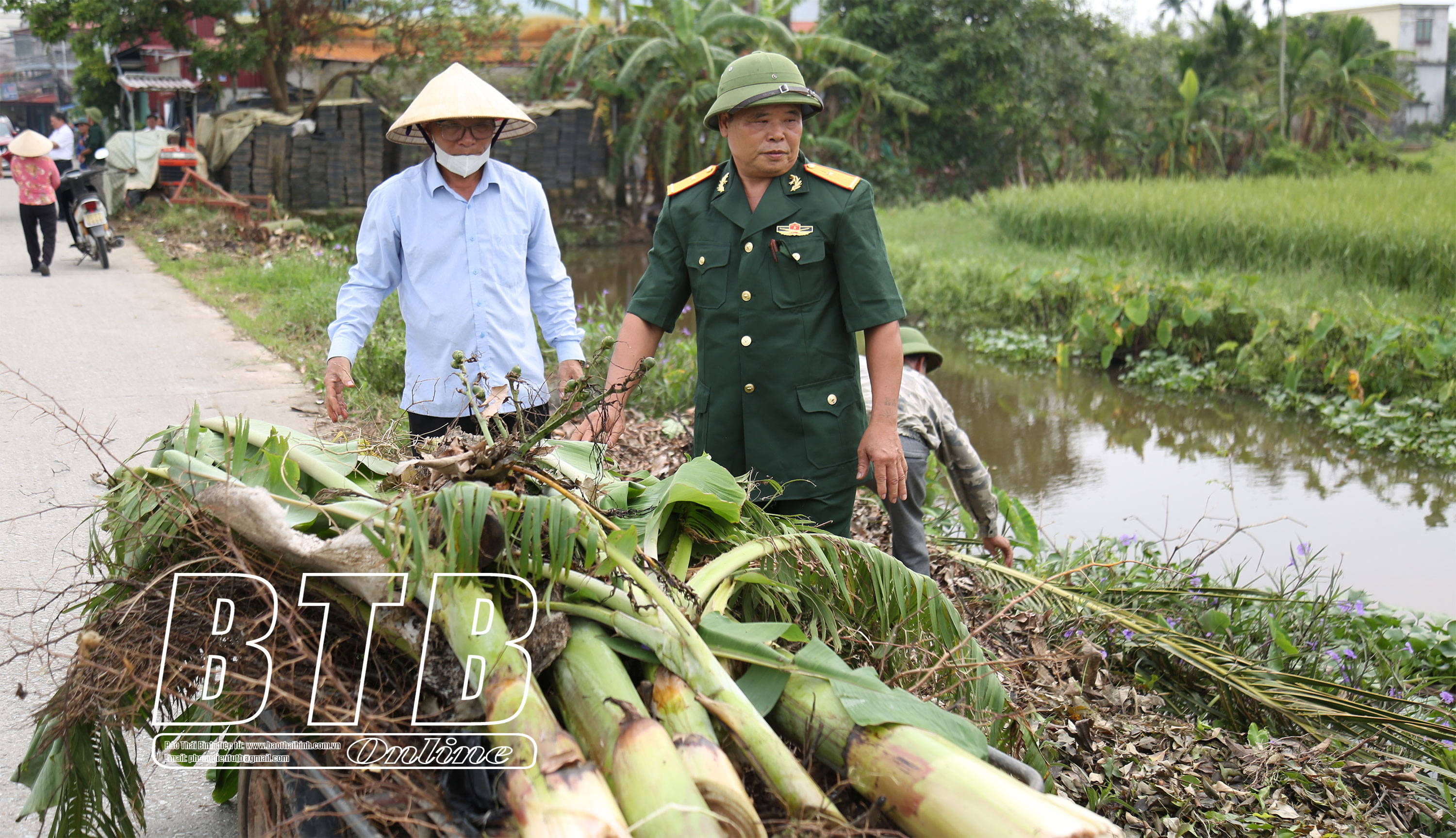 Cựu chiến binh Nguyễn Bá Hiện (áo xanh) cùng các hội viên tham gia dọn vệ sinh môi trường.