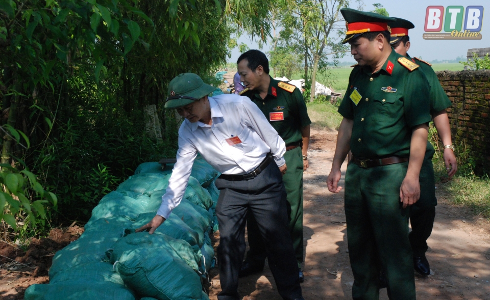 Lãnh đạo Bộ Chỉ huy Quân sự tỉnh và huyện Kiến Xương kiểm tra khu vực thực binh đắp đê chống tràn tại khu vực bến đò Cồn Nhất, xã Hồng Tiến.
