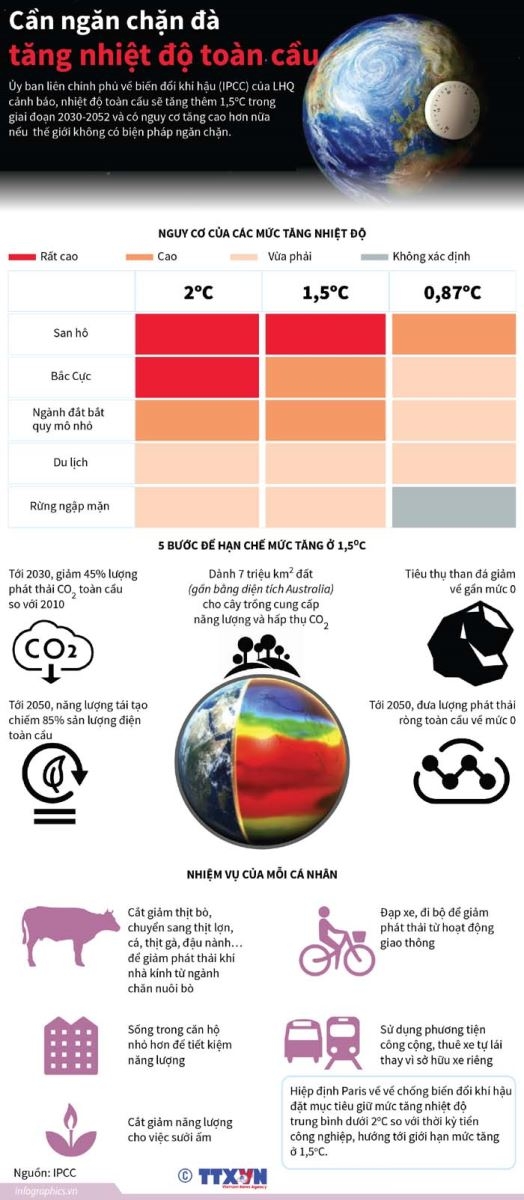 Ủy ban liên chính phủ về biến đổi khí hậu (IPCC) của LHQ cảnh báo, nhiệt độ toàn cầu sẽ tăng thêm 1,5 độ C trong giai đoạn 2030-2052 và có nguy cơ tăng cao hơn nữa nếu thế giới không có biện pháp ngăn chặn.