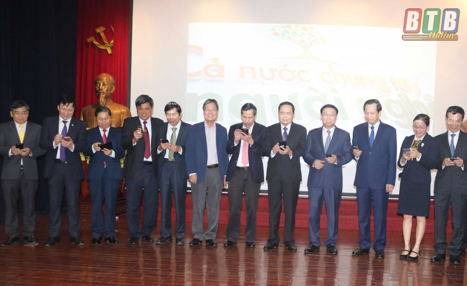 Đồng chí Vương Đình Huệ, Ủy viên Bộ Chính trị, Phó Thủ tướng Chính phủ, Trưởng ban Chỉ đạo các chương trình mục tiêu Quốc gia cùng lãnh đạo các bộ, ngành và nhà tài trợ phát động nhắn tin “Cả nước chung tay vì người nghèo” năm 2018.