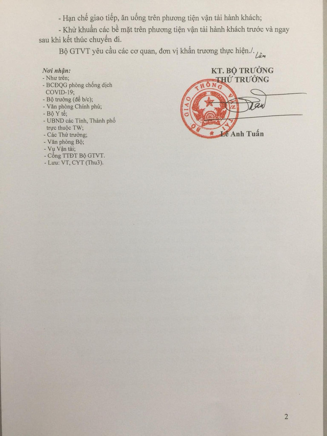 Ngoài ra, Bộ Giao thông Vận tải cũng yêu cầu thực hiện nghiêm các biện pháp đảm bảo phòng chống dịch COVID-19 như đeo khẩu trang đúng cách tại các khu vực công cộng; thực hiện khai báo y tế, thường xuyên rửa tay bằng xà phòng hoặc dung dịch sát khuẩn; kiểm tra thân nhiệt; hạn chế giao tiếp, ăn uống trên phương tiện vận tải hành khách; khử khuẩn các bề mặt phương tiện vận tải hành khách trước và ngay sau khi kết thúc chuyến đi.