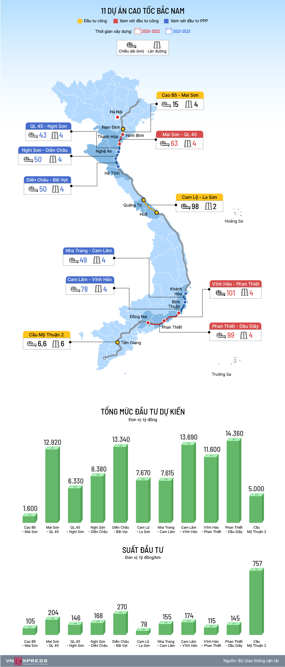 Mỗi dự án cao tốc Bắc Nam có tổng vốn dự kiến và suất đầu tư khác nhau, do phụ thuộc địa hình xây dựng và quy mô đường.