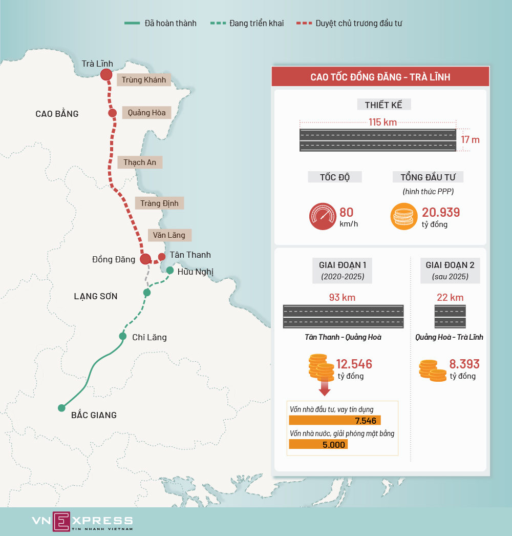 Cao tốc Đồng Đăng (Lạng Sơn) - Trà Lĩnh (Cao Bằng) được đầu tư theo 2 giai đoạn, với tổng vốn 20.939 tỷ đồng.
