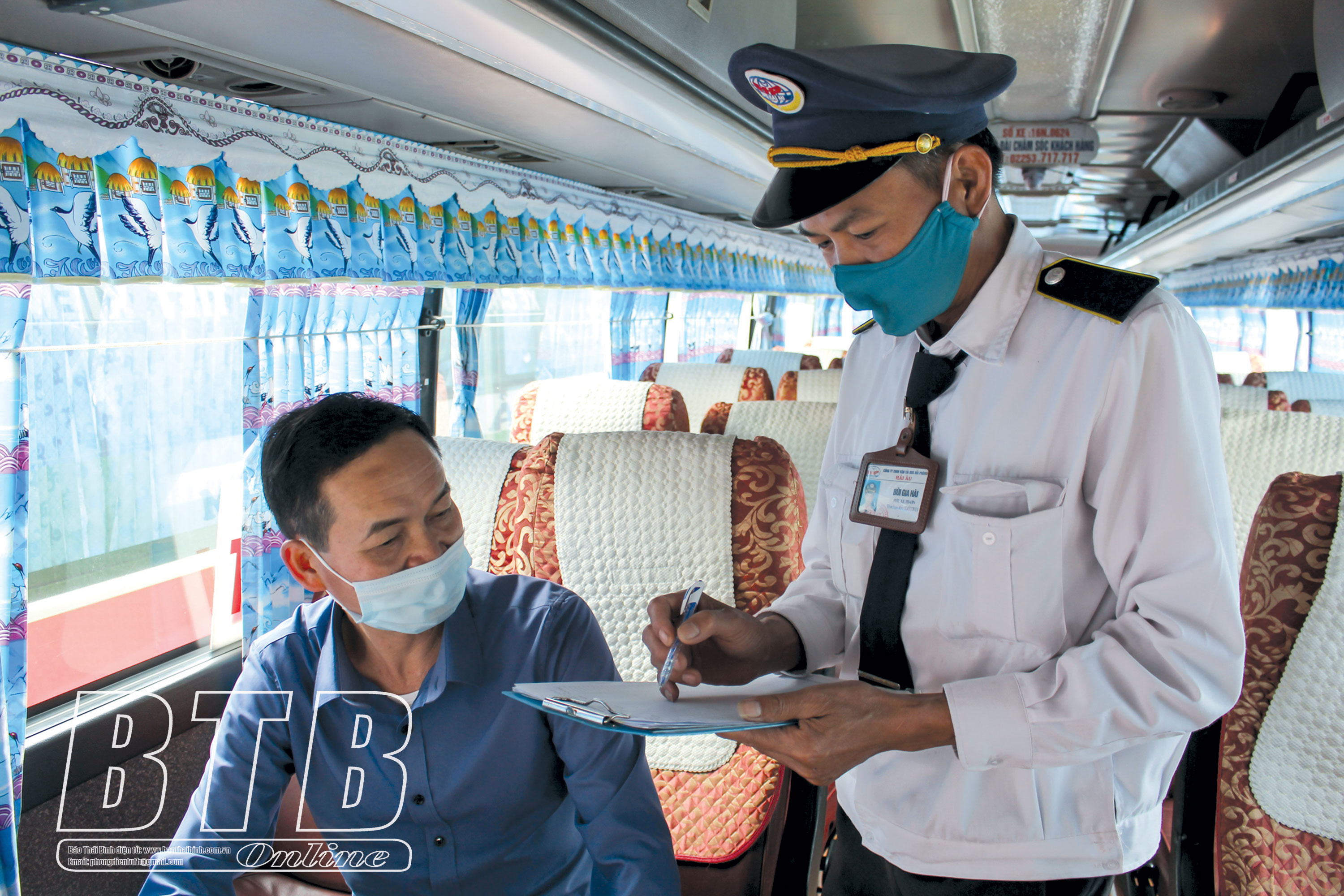 Khác với các phương tiện chạy tuyến cố định liên tỉnh đang vắng khách, trên những tuyến xe buýt chạy các tuyến nội tỉnh hiện nay lại có khá nhiều hành khách đi lại. Đi trên tuyến xe buýt thành phố Thái Bình - Thụy Tân (Thái Thụy) của nhà xe Phiệt Học, chúng tôi thấy có gần 20 hành khách trên xe. Toàn bộ hành khách và lái xe, nhân viên phục vụ trên xe đều đeo khẩu trang, rửa tay bằng dung dịch sát khuẩn khi lên xe.
