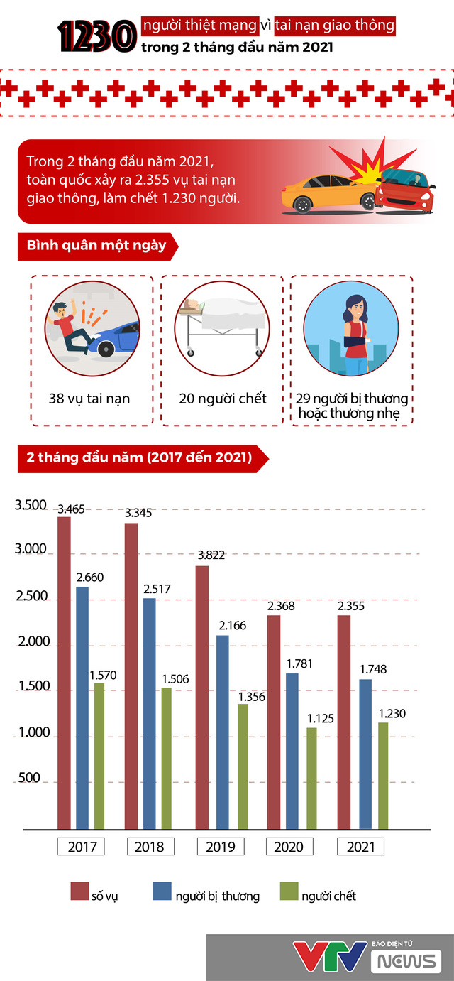 Trong 2 tháng đầu năm 2021, số vụ và số người bị thương do tai nạn giao thông có giảm nhẹ so với cùng kỳ năm trước, nhưng số người thiệt mạng là 1.230 người, tăng 105 người so với cùng kỳ năm 2020.
