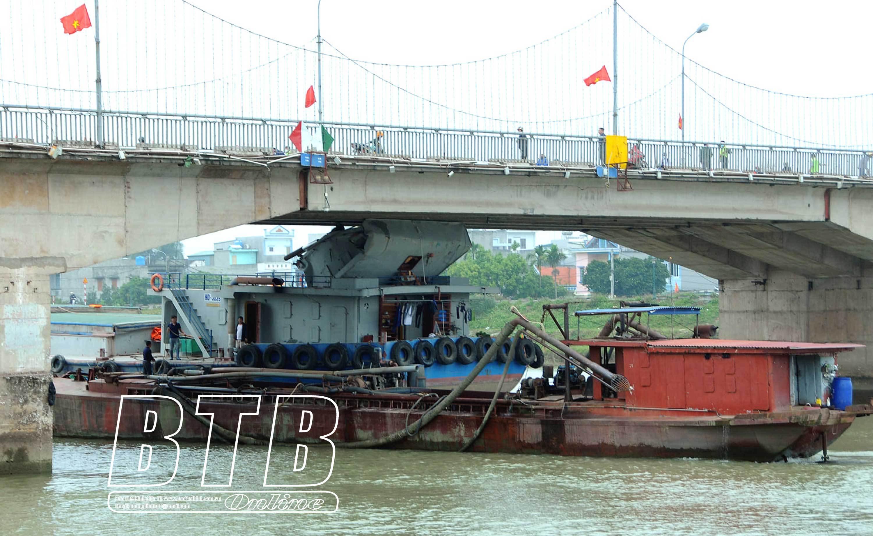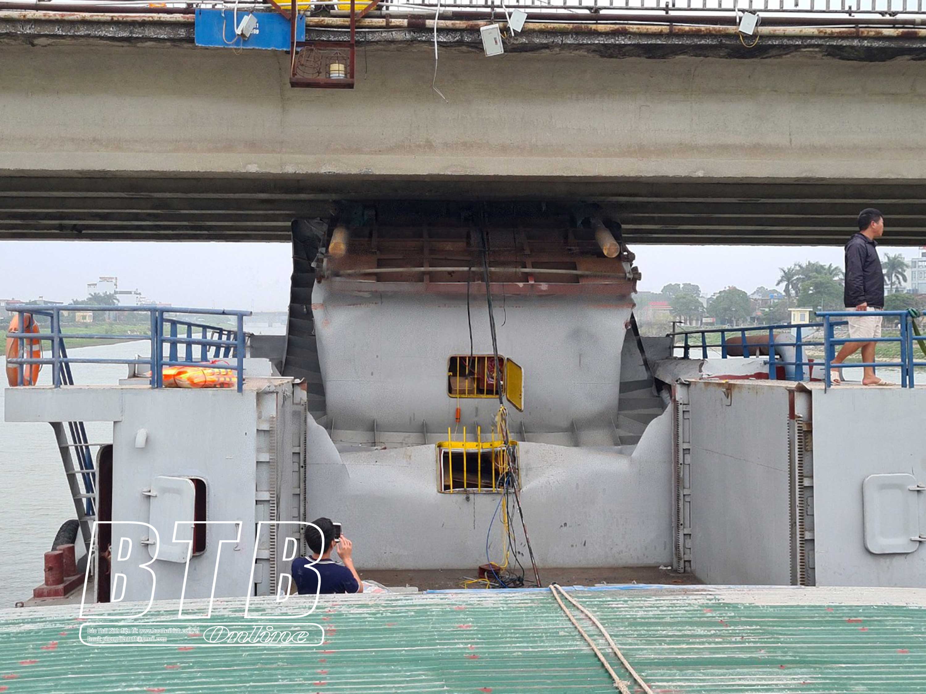 Toàn cảnh vụ va chạm. Tàu thủy HD.3839 bị mắc kẹt dưới gầm cầu Thái Bình.
