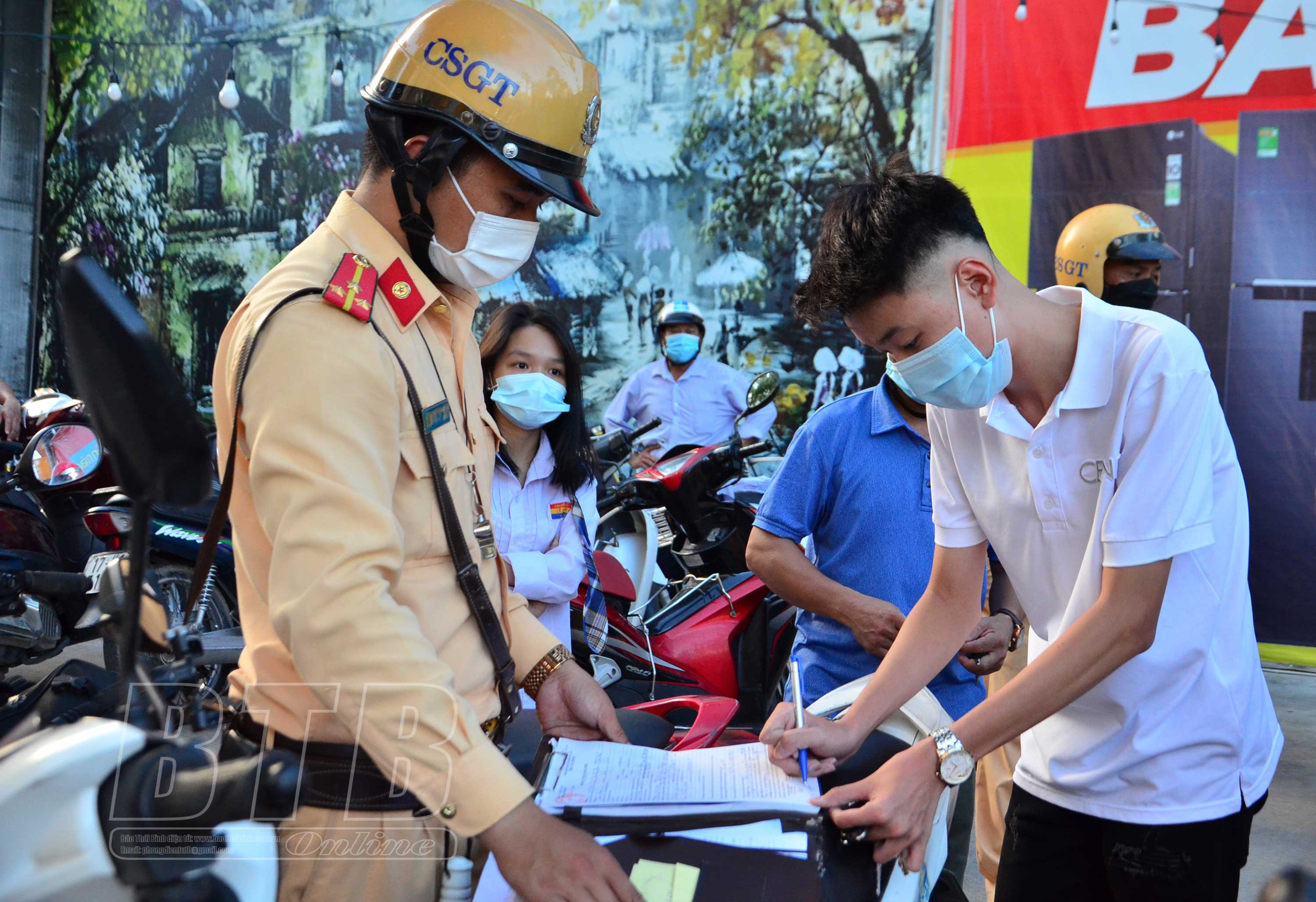 Lực lượng cảnh sát giao thông (Công an thành phố Thái Bình) lập biên bản xử lý các trường hợp dừng, đỗ xe trái quy định.