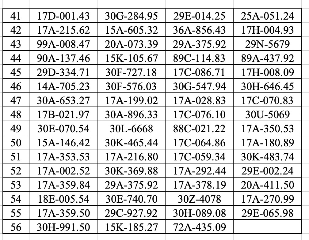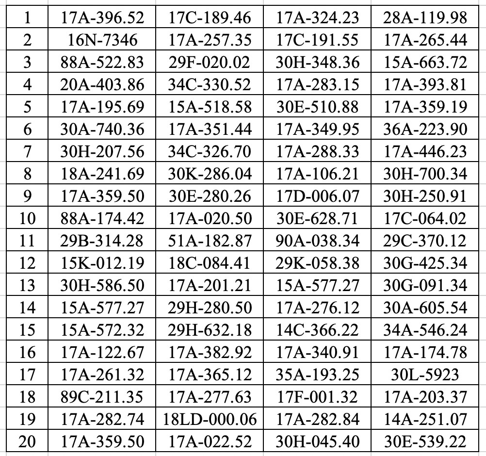 17A-151.79, 17A-132.73, 29B-304.53, 29B-304.53, 28A-183.48, 30H-222.26, 17A-146.69, 29C-934.87, 30L-348.60, 30G-749.64, 14A-708.78, 17B-014.64, 17A-051.00, 30F-404.84, 17A-166.24, 30A-482.35, 29Y-0416, 30A-673.46, 17C-066.14, 17A-218.43